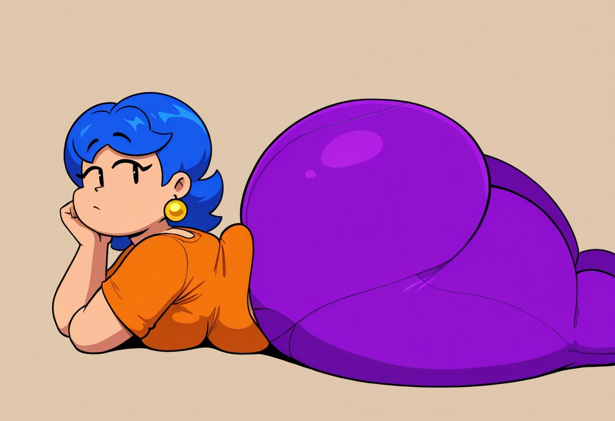 blue hair, yellow earrings, orange T-shirt, purple pants