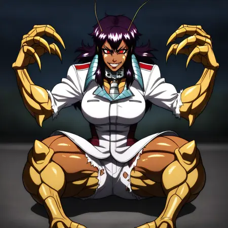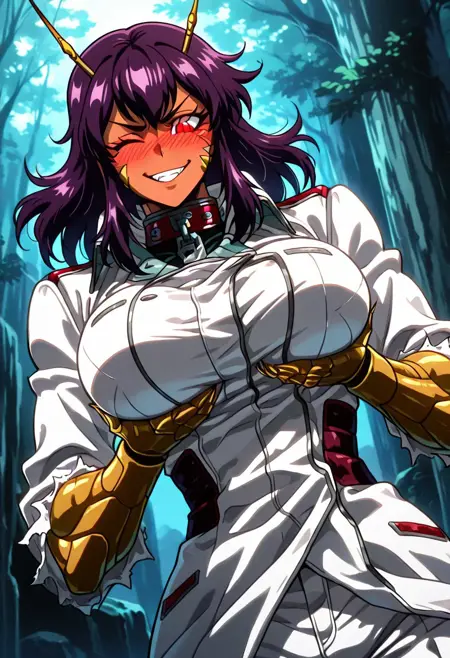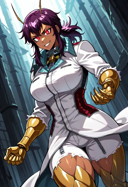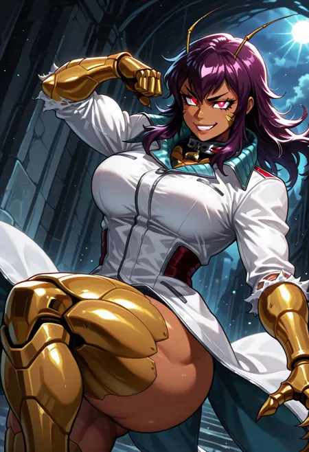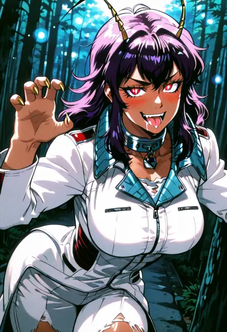 IsabellaRLeonTF, 1girl, solo, 몬스터 소녀, 절지동물 소녀, 근육질의 여자, 곡선이 있는 몸매, 검은 피부, 검은 피부를 가진 여자, 보라색 머리, 긴 머리, 앞머리, 촉각, 붉은 눈, 두꺼운 입술, 악랄한 미소, 큰 가슴, 복장, 칼라, 흰 재킷, 흰 바지, 두꺼운 허벅지, 큰 엉덩이, 찢어진 옷, 과다질 팔, 과다질 다리, 발톱,
