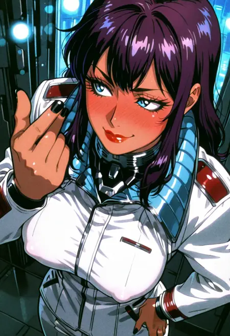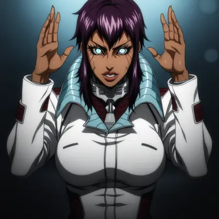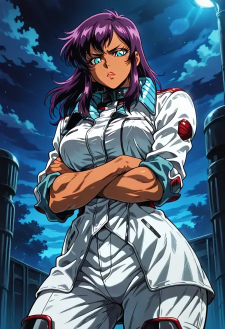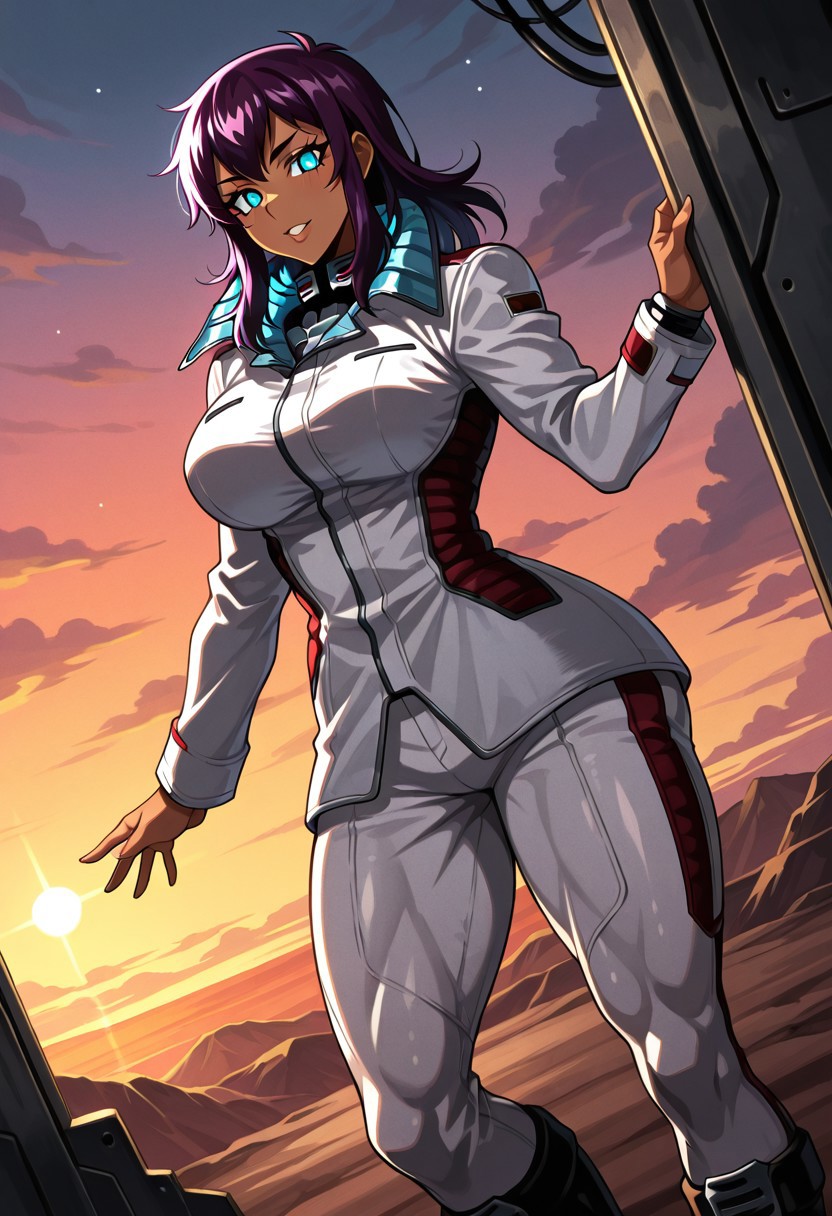 IsabellaRLeonTF, 1girl, solo, 근육질의 여자, 곡선이 있는 몸매, 검은 피부, 검은 피부를 가진 여자, 보라색 머리, 긴 머리, 앞머리, 파란 눈, 두꺼운 입술, 큰 가슴, 군사 과학 소설 복장, 칼라, 흰 재킷, 흰 바지, 두꺼운 허벅지, 큰 엉덩이, 부츠,