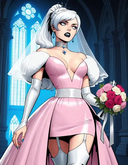 白色服装,金色头发,蓝色眼睛,面无表情,闪亮胸衣,闪亮超短裙,侧开衩超短裙,钻石胸衣肩带,毛茸茸的肩部,(白色皮革吊带长靴),斗篷,妆容,嘴唇,鼻子,裸露的手臂