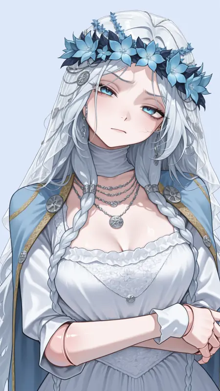 白色连衣裙, 面纱, 饰品, 项链, 白色袖子, 蓝色斗篷, 手腕袖口