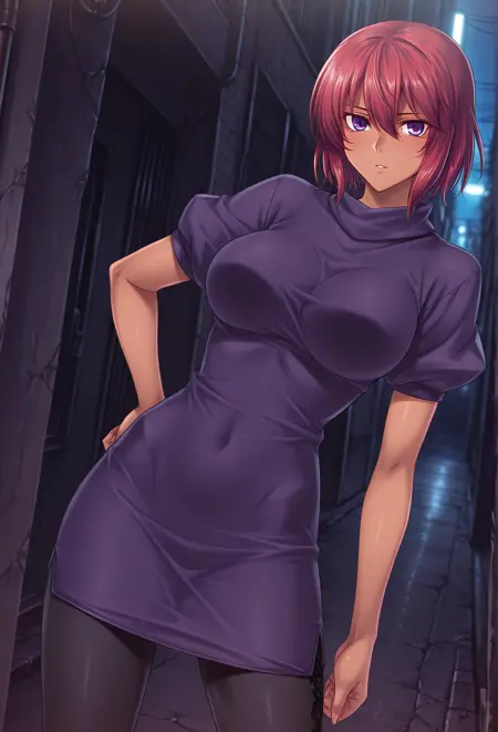 Prompt: AyaseRyouko, 1girl, red hair, purple eyes, dark-skinned female, tan