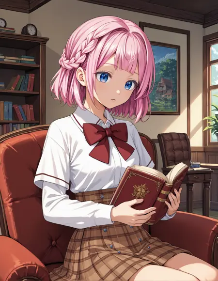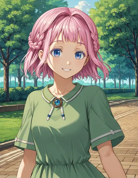 외모: 분홍색 머리, 반쯤 올린 땋은 머리, 파란 눈, 그라데이션 눈