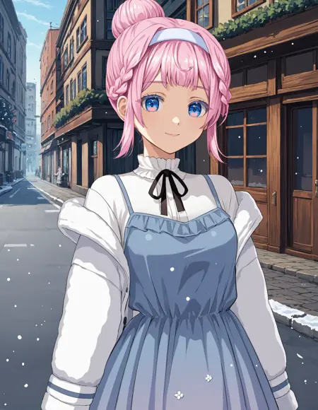 겨울 복장: mgrcyurahotaru, yurawtr, 머리 땋기, 흰 헤어밴드, 흰색 주름 상의, 검은 넥 리본, 파란 피나포어 드레스, 열린 흰색 겨울 코트, 소매가 손가락을 넘음, 흰색 허벅지 스타킹