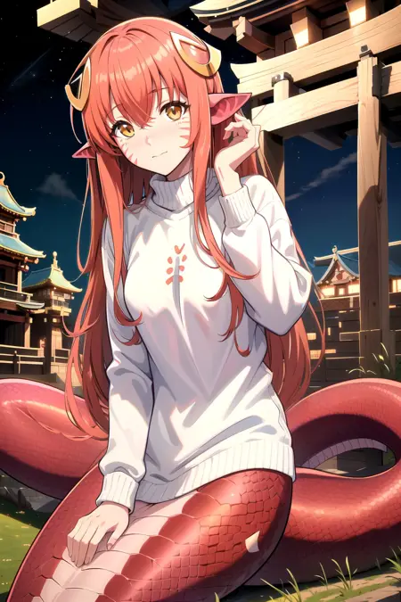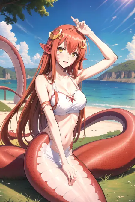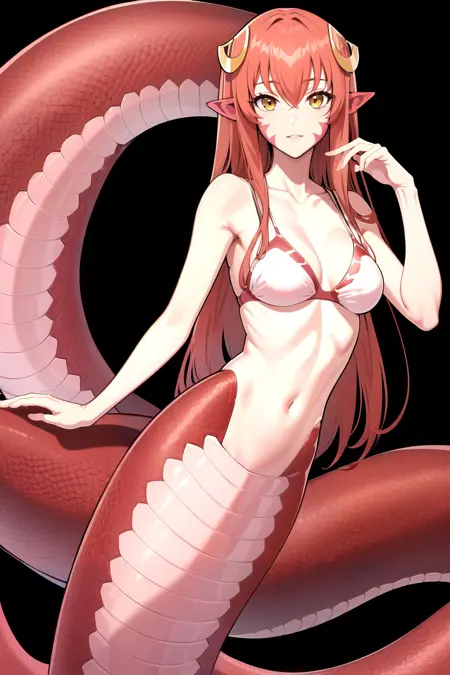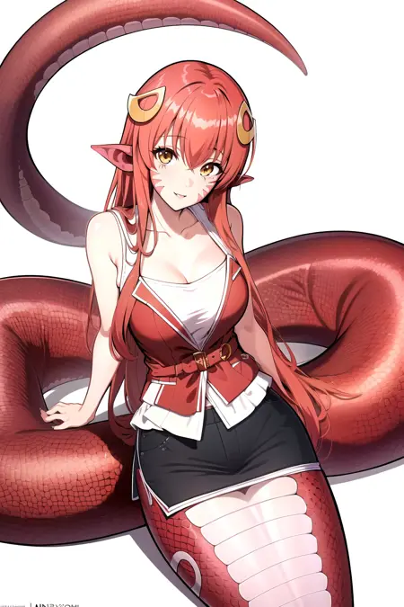 트리거 단어: miiamiia, miia \(monster musume\), lamia, facial mark, monster girl, hair ornament, pointy ears, yellow eyes, red hair, long hair, slit pupils,