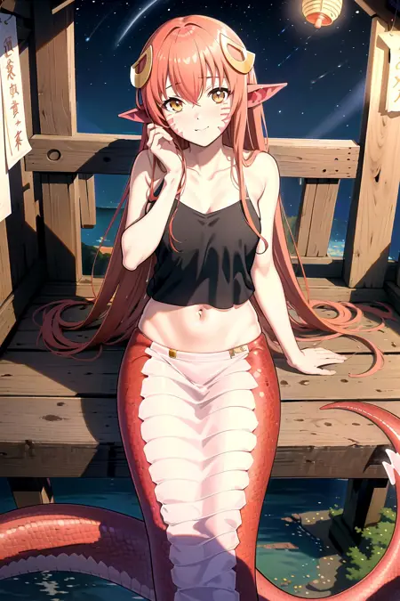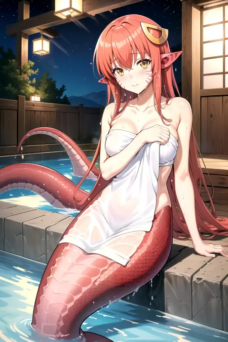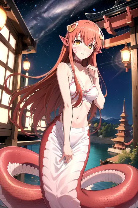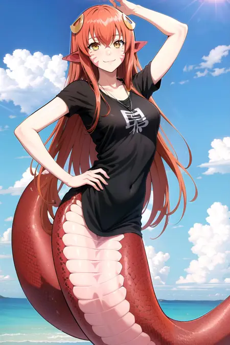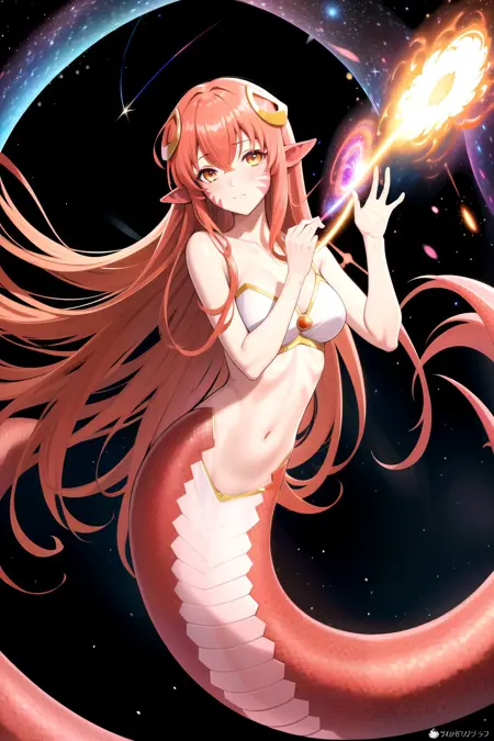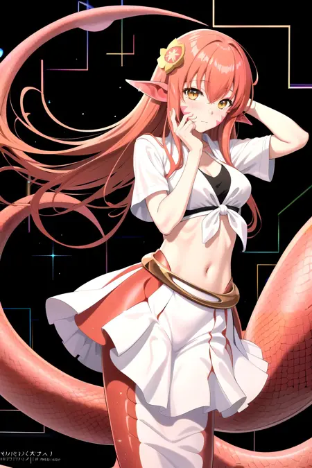 Trigger Word: miiamiia, miia \(monster musume\), lamia, facial mark, monster girl, hair ornament, pointy ears, yellow eyes, red hair, long hair, slit pupils,
