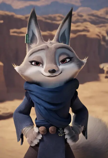 zhenfox, fox, anthro, furry, female, 3D, cgi, hazel eyes, gray fur, black nose, blue scarf, burlap pants, four fingers, floppy ears, whiskers, shortstack,