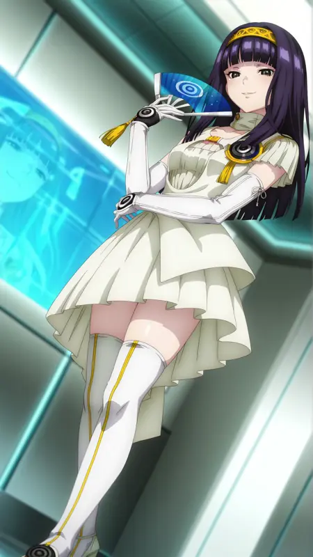 옷차림: 헤어밴드, 흰색 팔장갑, 흰색 드레스, 하이힐, 허벅지 양말, 젯타이 리ょう키