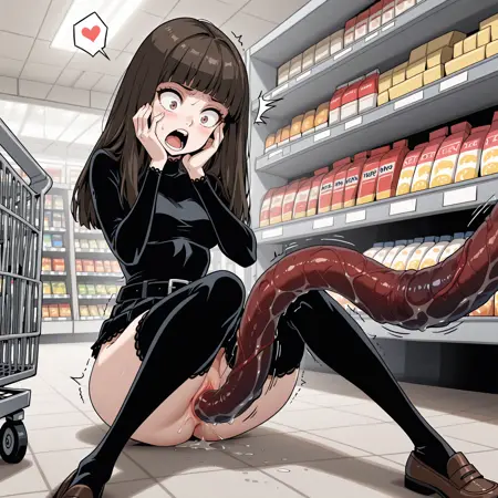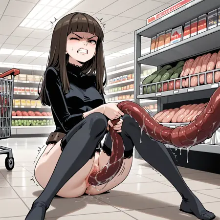 SURPRISETENTACLEXD, タコセックス, 陰部へのタコ挿入, タコによる抓住, 床の上, もがいている, 座った姿勢, 膝を閉じて足を広げた, 前に傾く