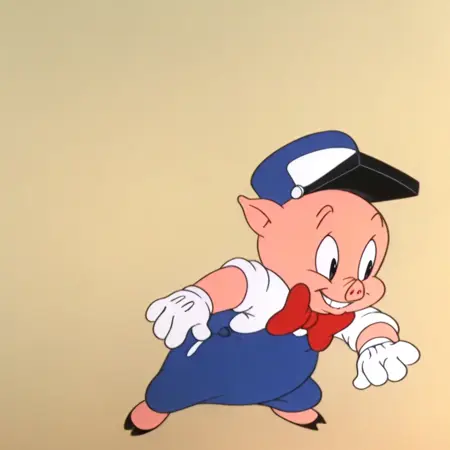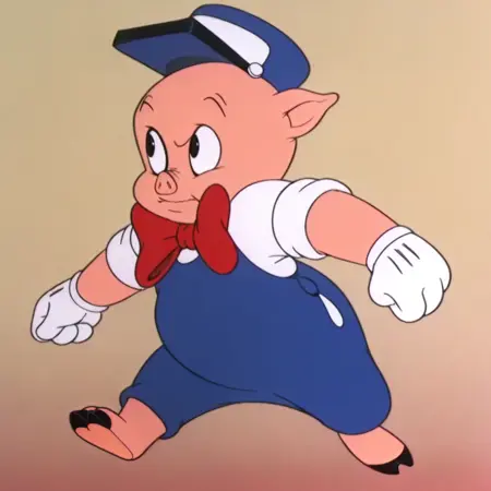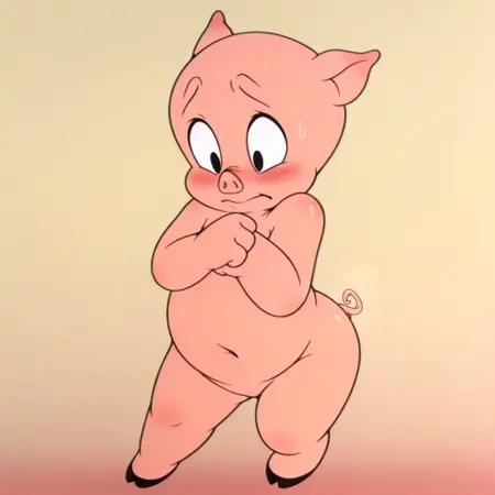 pig, male, slightly chubby, pink skin, black eyes, pointed ears, white gloves, animal feet, 2d, screencap