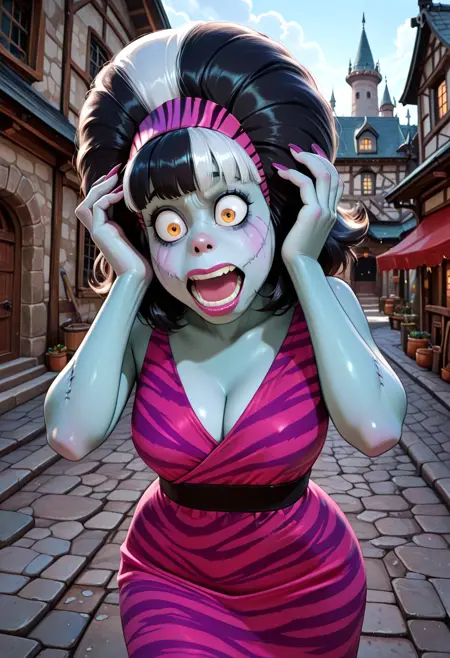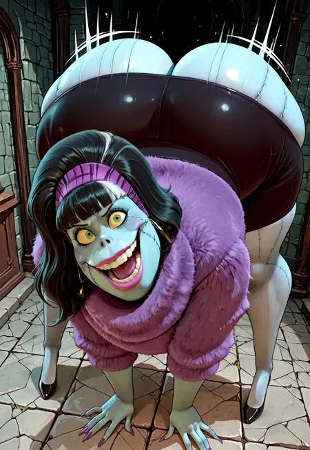 缝合线,面部缝合线,灰色皮肤,蓝色皮肤,彩色皮肤,上翘鼻子,发带,蓬松发型,