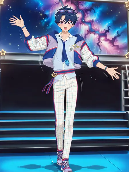 学校伙伴酷风:jacket, necktie, pants, blue necktie, eyewear on head, watch, shoes, sneakers, shirt, star /(symbol/), wristwatch, school_mates_cool, subaru_verse