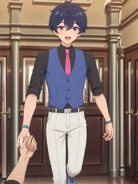 服饰内:shirt, vest, pink necktie, necktie, pants, blue footwear, wristwatch, white pants, jewelry, shoes, short hair, black shirt, bracelet, collared shirt, waistcoat, sleeves rolled up, subaru_verse, future_school_cool