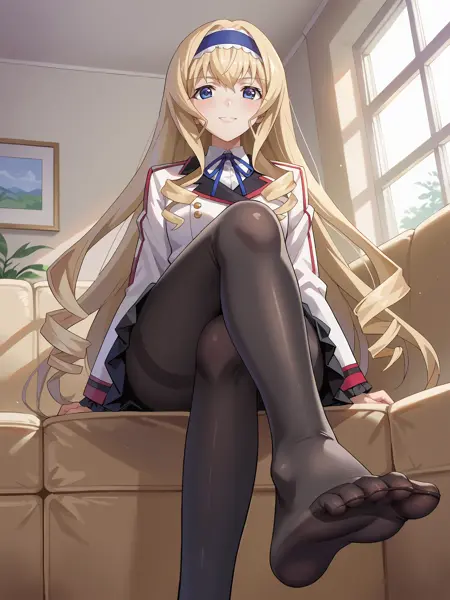 デフォルトのJK制服: 青いヘアバンド、青いネックリボン、インフィニット・ストラトスアカデミーの校服、黒いパンティーホース、ローファー