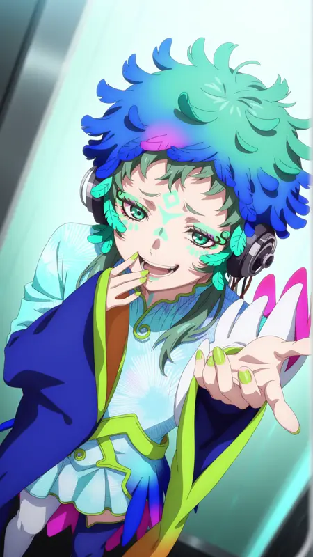 Appearance:facial mark, makeup, eyeshadow, facepaint, green hair,androgynous,blue eyes,blue hair,multicolored hair,eyelashes,