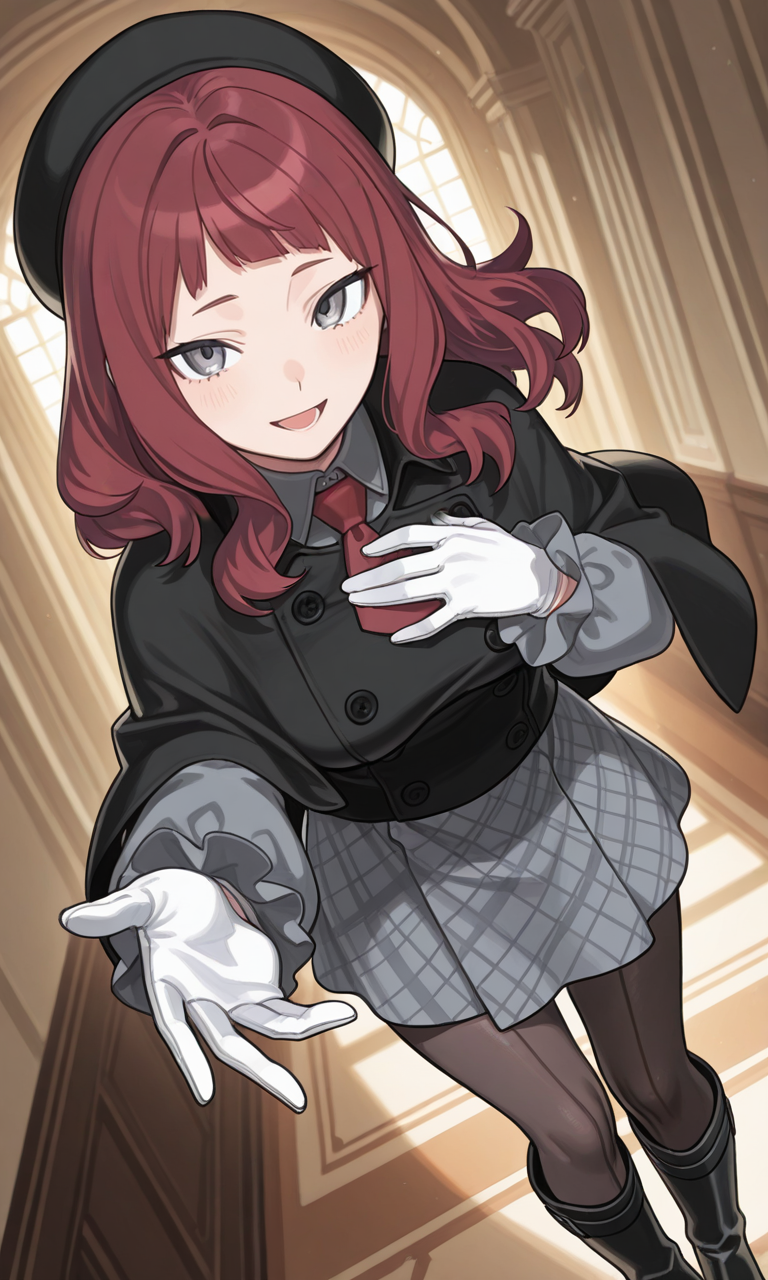 beret, dress shirt, short necktie, double-breasted poncho, gloves, gingham skirt, pantyhose, knee rain boots