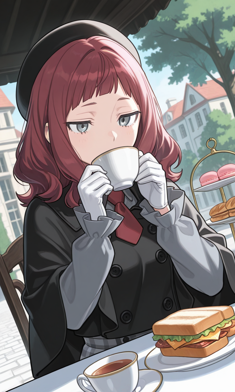 eden clements, grey eyes, tsurime, jitome, expressionless, red hair, medium hair, wavy hair, fluffy hair, arched bangs, sidelocks