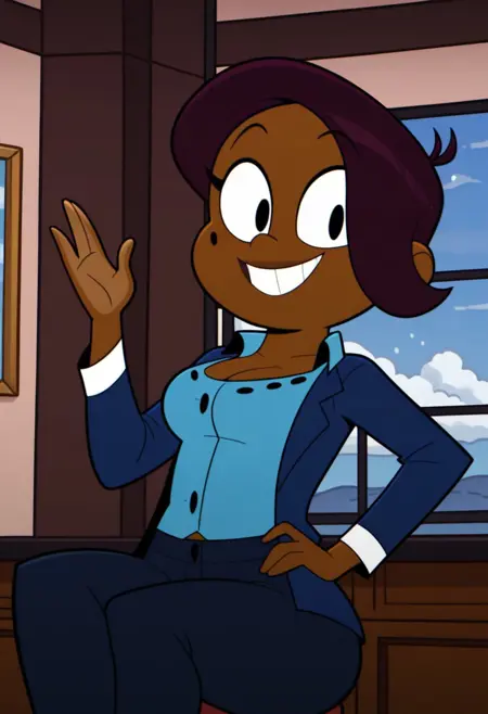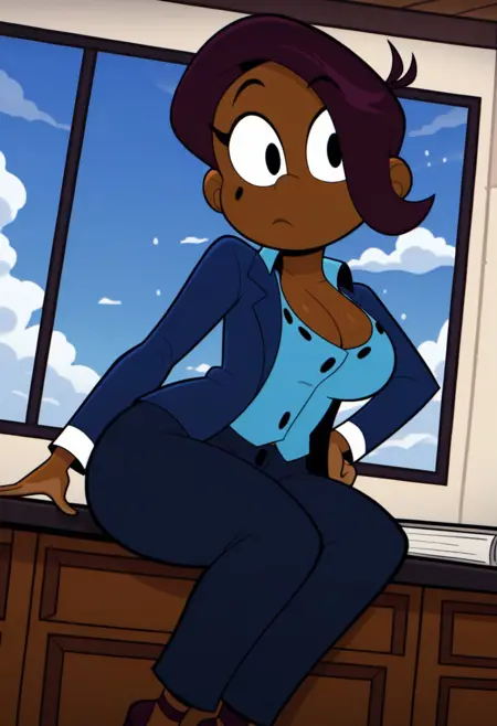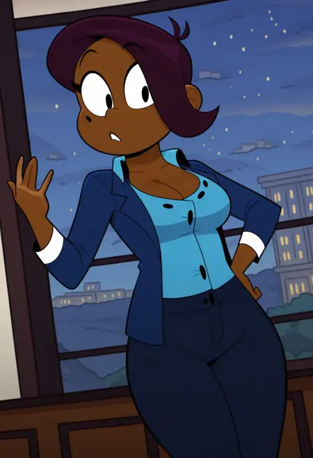 기본 프롬프트: millie martins, 검은 피부, 두더지, 진보라색 머리카락, 파란색 셔츠, 진한 파란색 재킷, 진한 파란색 바지, 진보라색 힐