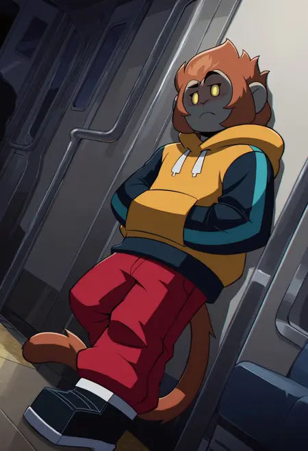 alternate costume, alt3, yellow hoodie, navy blue sleeves, teal stripe, red pants, black shoes