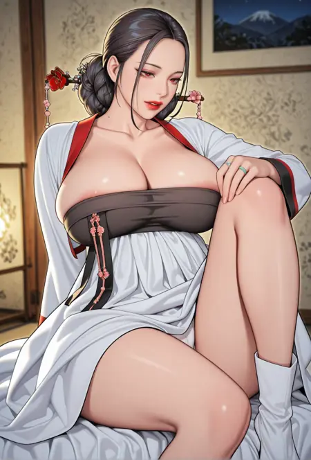 1人Girl、ユク・ナニャン、一人、成熟した女性、白い肌、赤い目、長いまつ毛、目下のほくろ、黒髪、髷、髪飾り、花の髪飾り、髪止め、サイドロール、ほつれた髪、アップド。赤いリップ、波打つ口元、開いた唇、化粧、首のほくろ、巨乳、鎖骨、