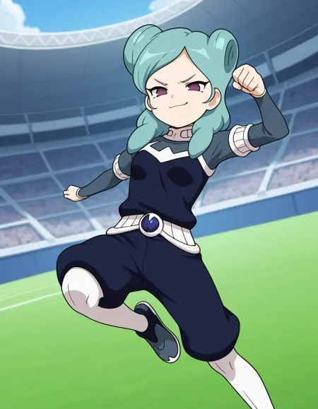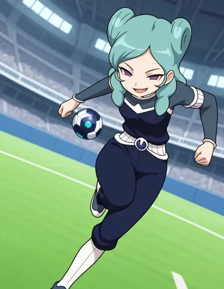 복장: 오메가 축구 유니폼, 짧은 점프수트, 파랑과 회색 점프수트, 작은 가슴, 회색 신발, 흰색 벨트, 긴 양말, 흰색 양말, 바지 안쪽 양말