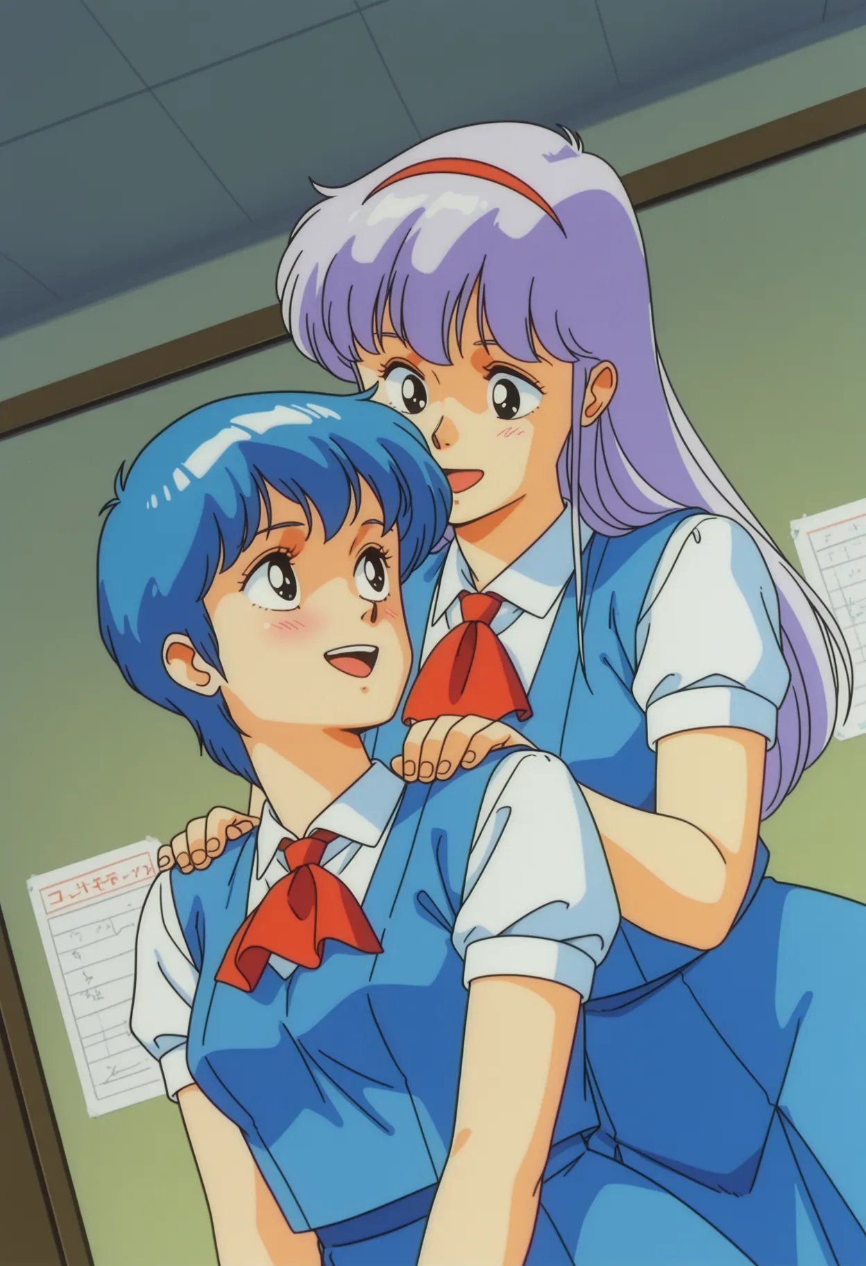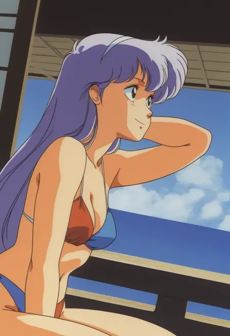 Appearance (Ponytail) : body_j_komaba, 1980s (style), film grain, light purple hair, long hair, bangs, ponytail, yellow bow, hair bow, blank eyes, medium breasts,