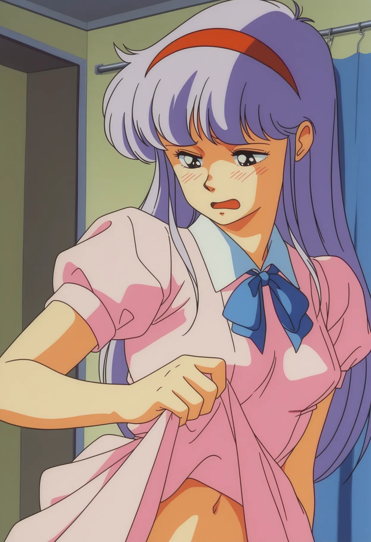 Appearance (Hairdown) : body_j_komaba, 1980s (style), film grain, light purple hair, long hair, bangs, hairband, blank eyes, medium breasts,
