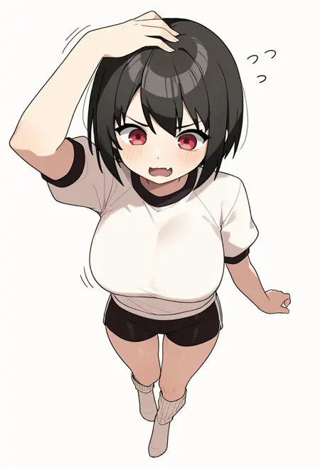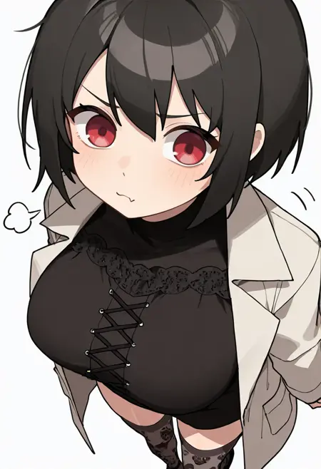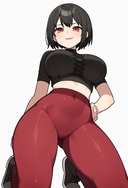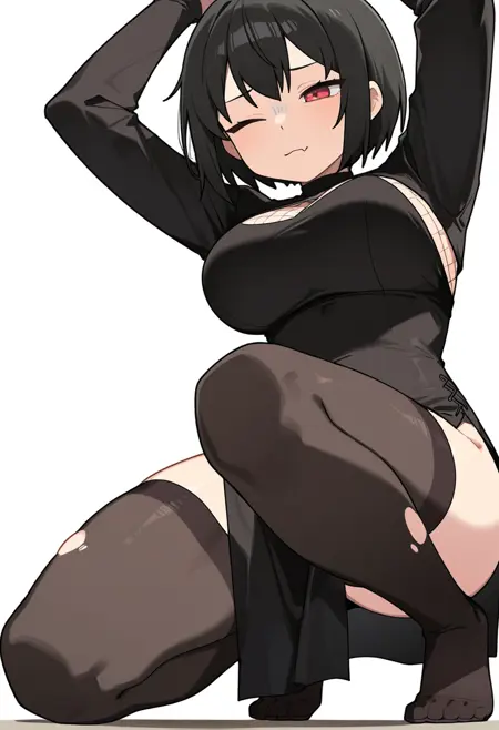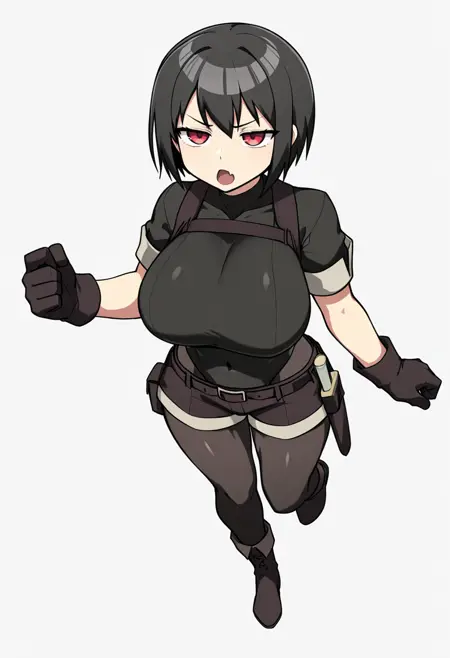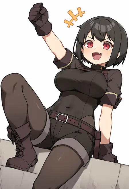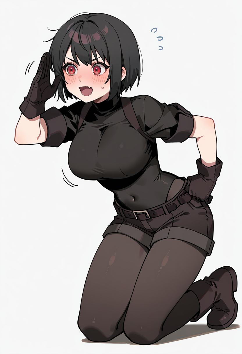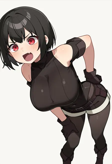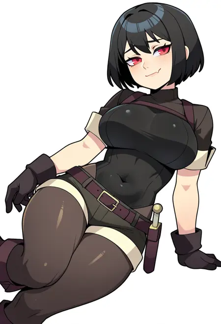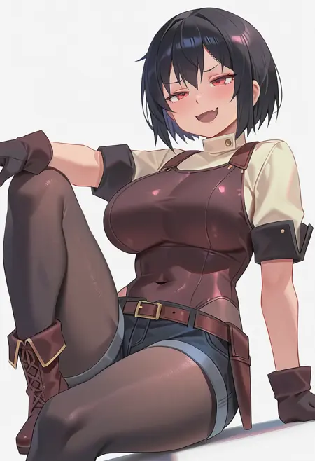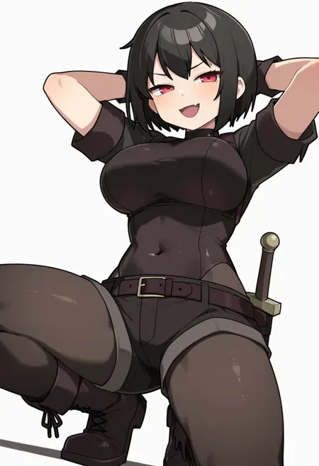 swordsgirl_cnr, 1girl, black hair, short hair, red eyes, skin fang, large breasts,
