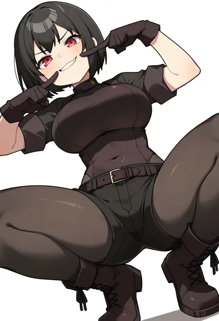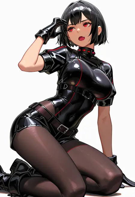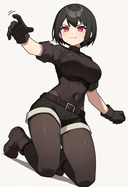 covered navel, black gloves, leotard, shorts, black pantyhose, belt, boots, short sleeves,