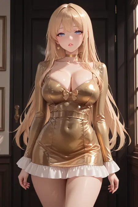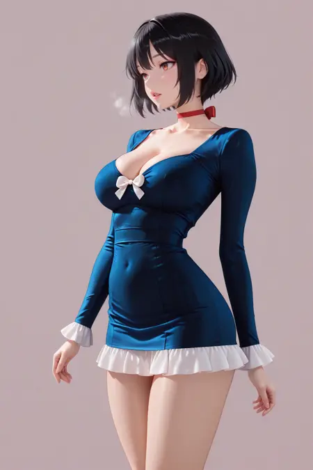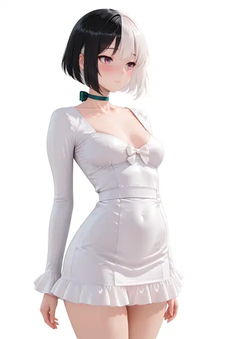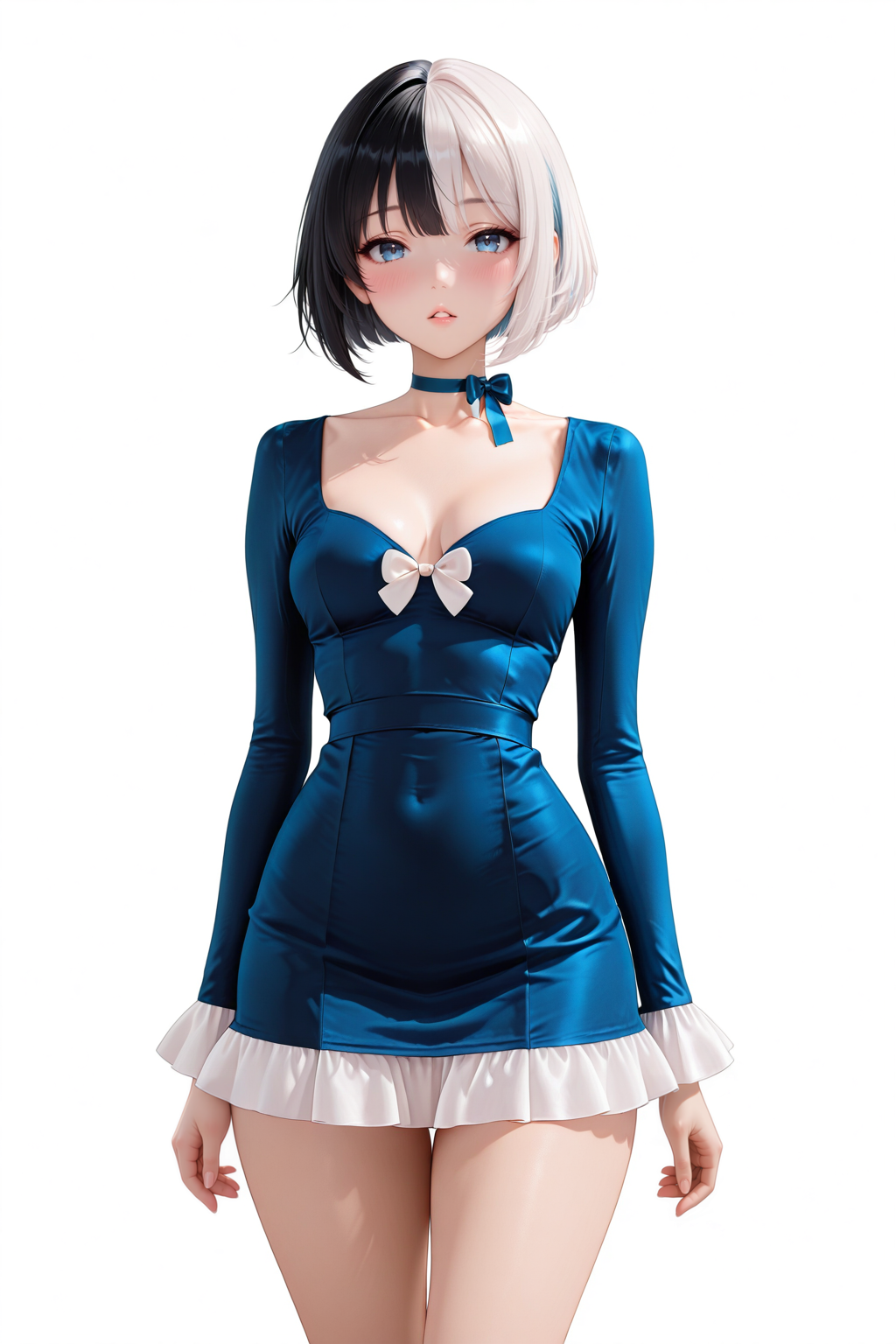 풍부한 색상의 몸에 딱 맞는 미니 드레스로, 긴 소매가 특징입니다. 소매 끝과 밑단에는 넓은 흰색 러플이 장식되어 강렬한 대비를 이루며 낭만적인 분위기를 더합니다. 깊은 사각 네크라인은 데콜테를 돋보이게 하며, 중앙에는 작은 흰색 리본이 달려 있습니다. 목에는 드레스와 같은 색상이거나 원하는 경우 다른 색상의 볼륨감 있는 리본 초커가 둘러져 있습니다. 소재는 매끄럽고 은은한 실크 광택이 있어 고급스러운 느낌을 강화합니다.