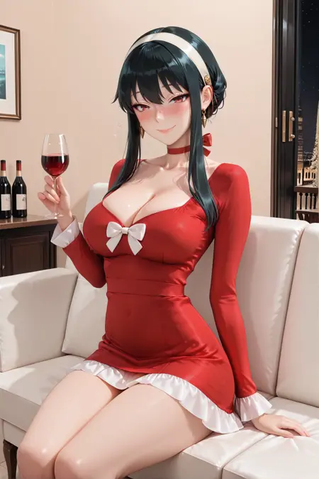 A form-fitting mini dress in a rich color, featuring long sleeves. The cuffs and hem are adorned with wide white ruffles that create a striking contrast and add a touch of romantic flair. A deep square neckline accentuates the décolletage, with a small white bow at the center. Around the neck is a voluminous ribbon choker that matches the dress or is in another color if desired. The fabric is smooth with a subtle satin sheen, enhancing the sense of luxury.