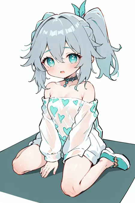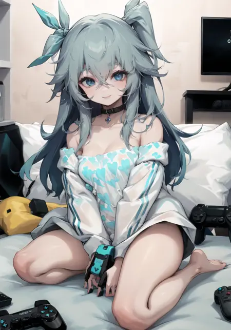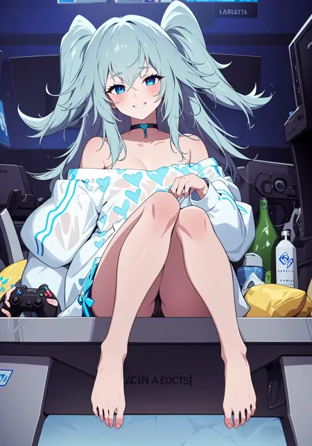 PS:キャラクターLoRAとして使用できます。推奨プロンプト: aqua outfit-yam pastry, 1girl, solo, long hair, blush, barefoot, heart, looking at viewer, bottle, sitting, blue eyes, bangs, smile, game controller, blue hair