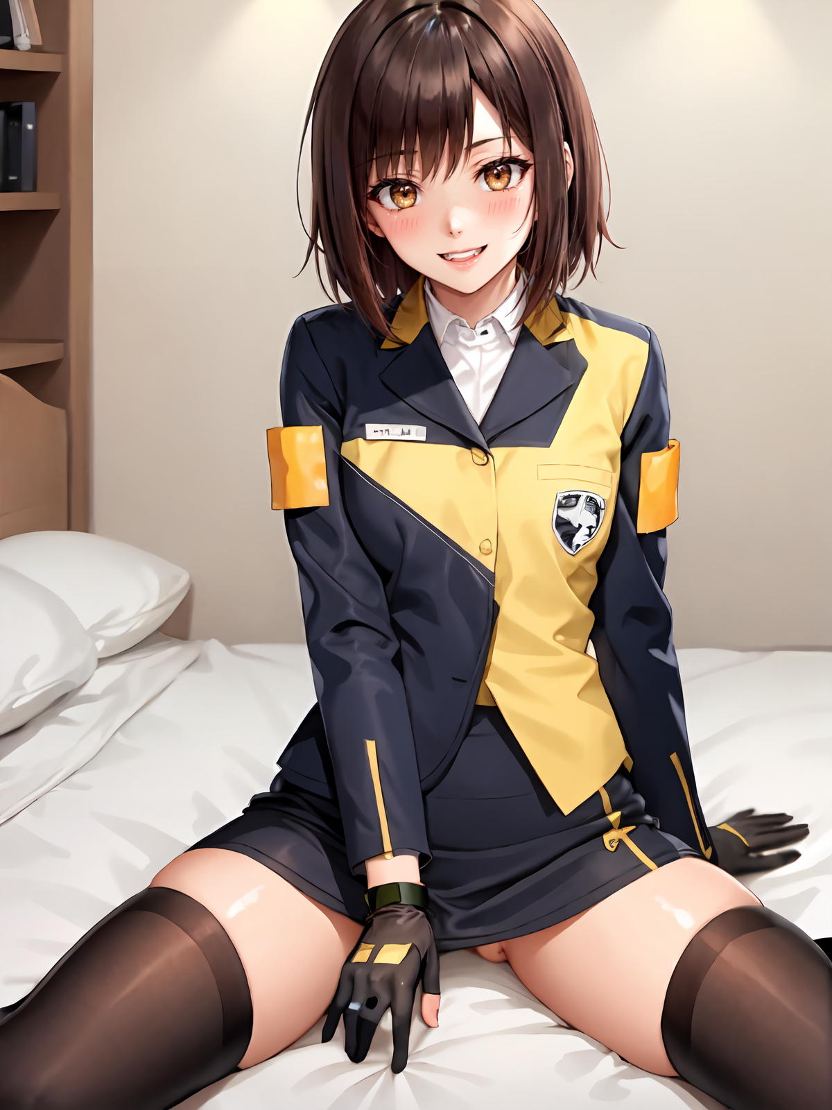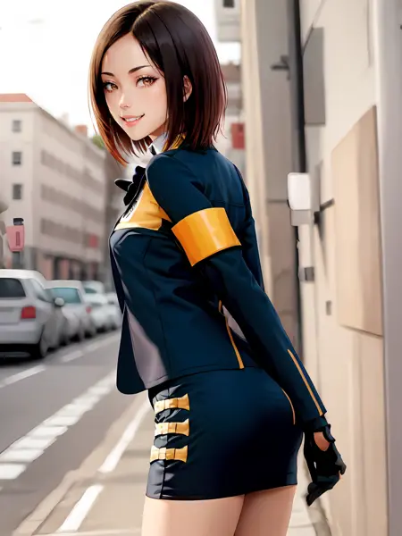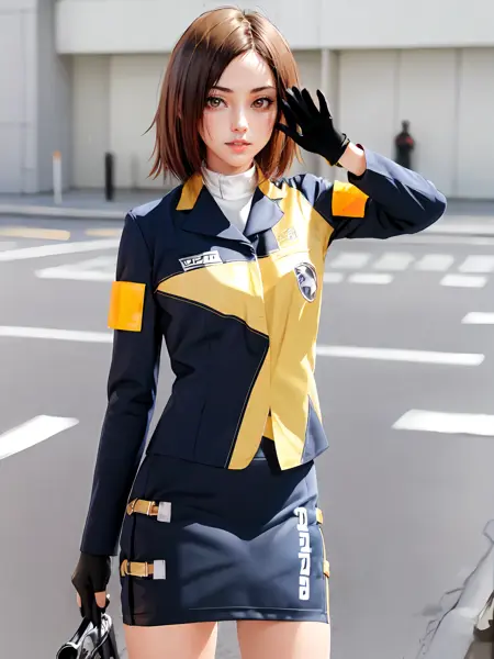 **Prompts:**fingerless gloves,armband,short hair, long sleeves,jacket,pencil skirt,boots,uniform, skirt, brown eyes, gloves, brown hair,