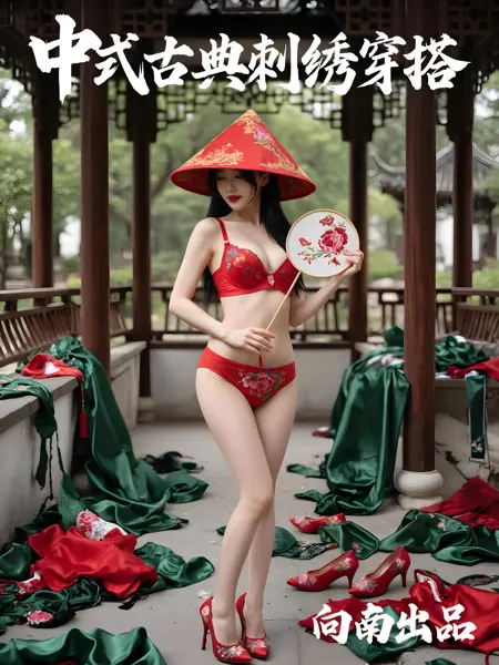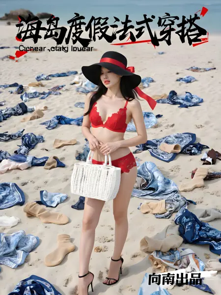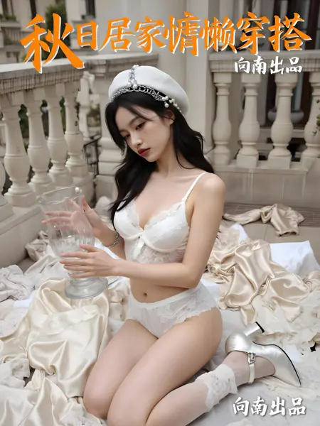 这是一幅专业的蕾丝内衣专场电商海报,远景拍摄,一位黑发亚洲女性,戴着银色链条贝雷帽,帽檐缀有珍珠装饰。她身穿白色蕾丝吊带内衣和同系列高腰内裤,脚上穿着 8cm 高的缎面玛丽珍鞋,双手轻扶透明玻璃花瓶,姿态优雅且魅惑。背景为复古欧式酒店露台,满地散落着米色真丝睡衣与蕾丝长袜,比较凌乱,显然是穿过的,营造出慵懒氛围。她的表情慵懒,嘴唇涂有豆沙色口红,整体风格精致且充满女人味。海报上方用动态朋克风中文印着 “秋日居家慵懒穿搭”,最下方右边用同样字体印着 “向南出品”