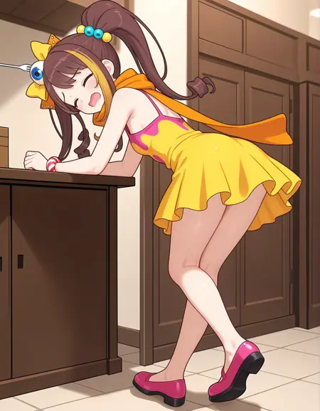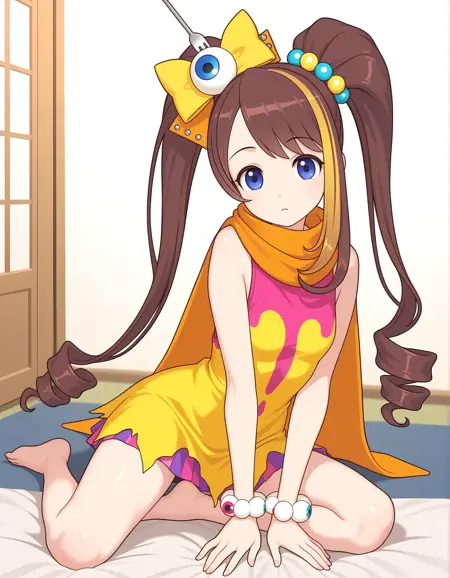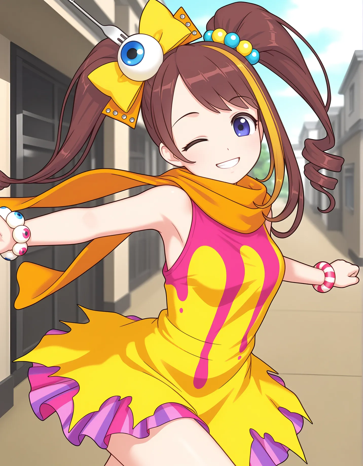 otofessuzune,long hair,brown hair,twintails,multicolored hair,sidelocks,single sidelock,twin drills,hair ornament,blue eyes,small breasts,eyeball,eyeball hair ornament,yellow dress,multicolored clothes,scarf,