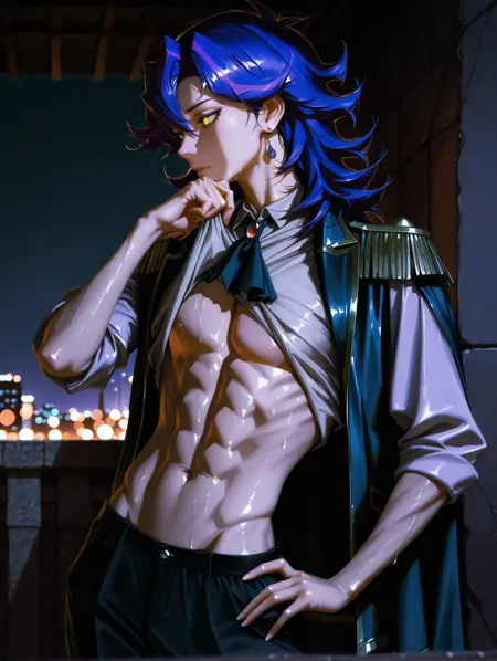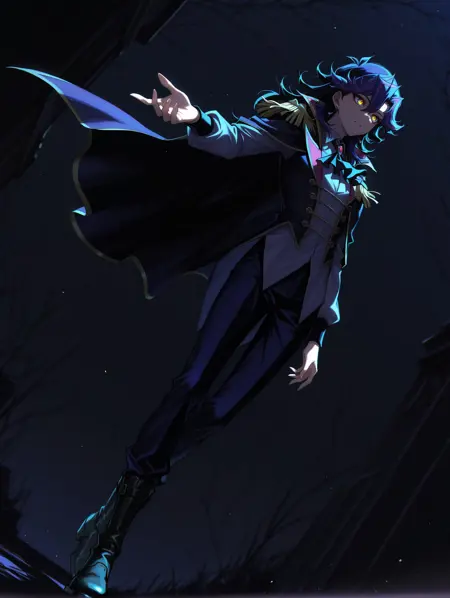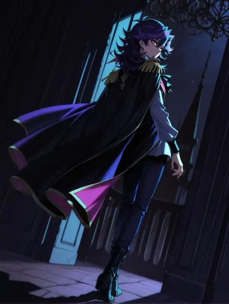복장 프롬프트 : collared shirt, jacket, epaulettes, ascot, earrings, cape, long sleeves, black pants, boots