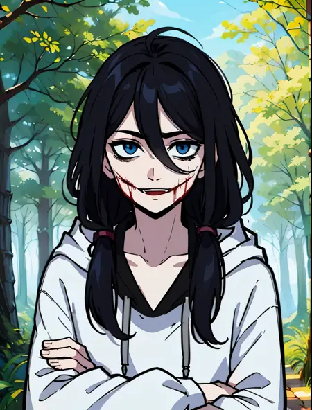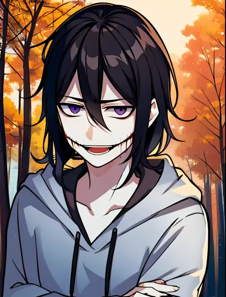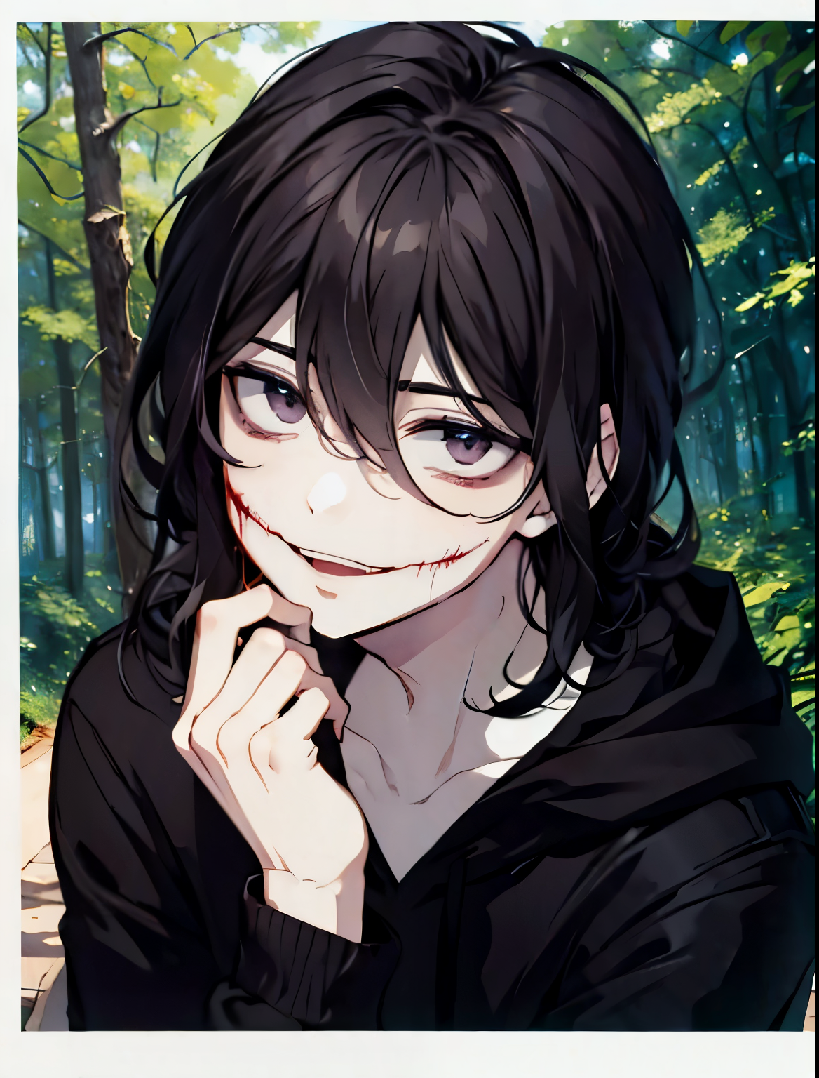 jeff, 1boy, hoodie, smile, blood on face, open mouth, long sleeves, hair between eyes, black hair, medium hair, scar in mouth, male focus, pale skin, blood from mouth
