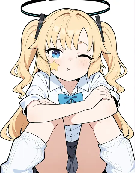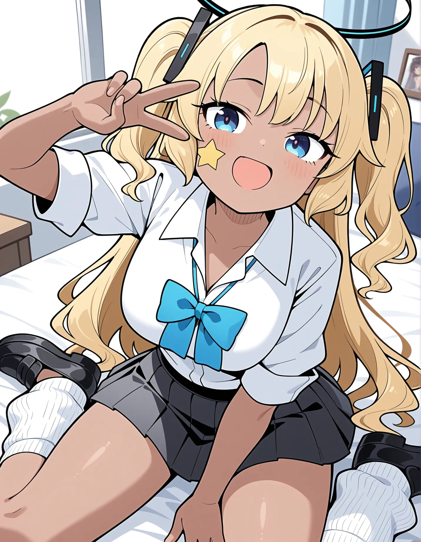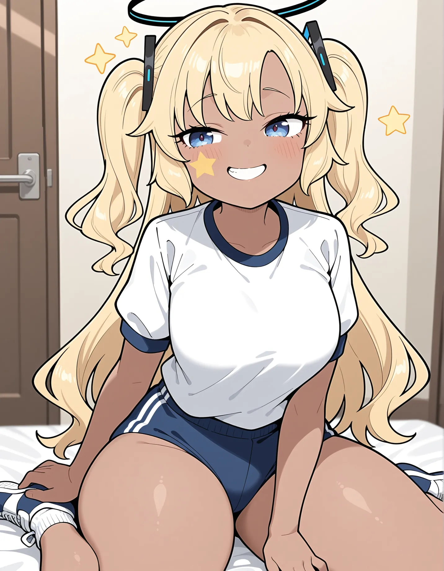 gyaruyuukablu,dark-skinned female,blue archive,blonde hair,long hair,twintails,sidelocks,asymmetrical bangs,facial mark,star \(symbol\),gyaru,halo,yuuka \(blue archive\),