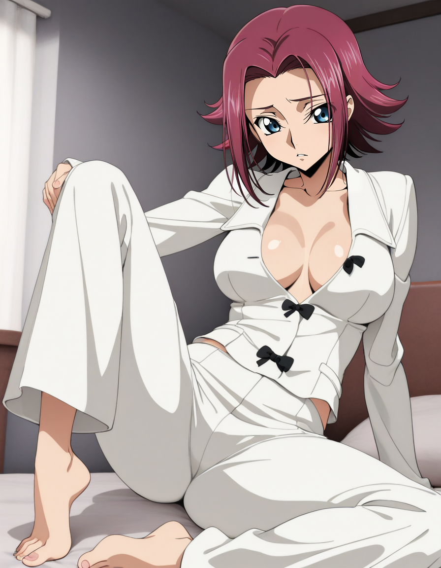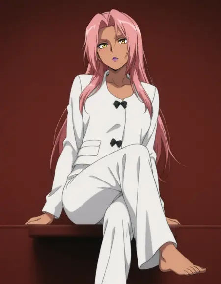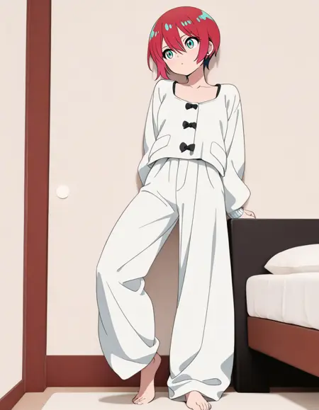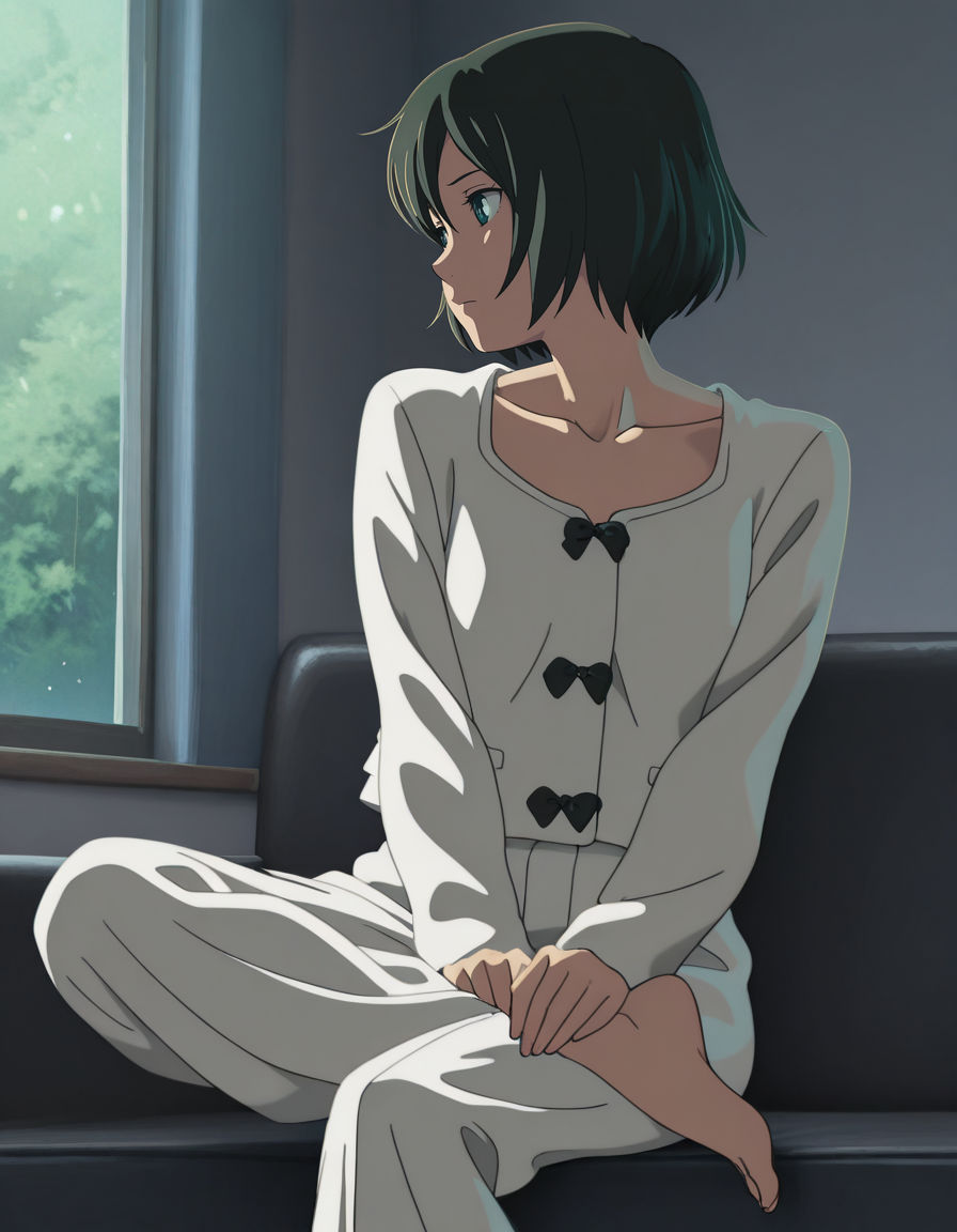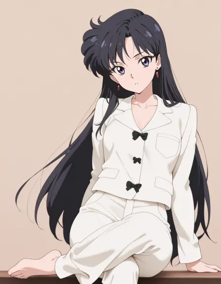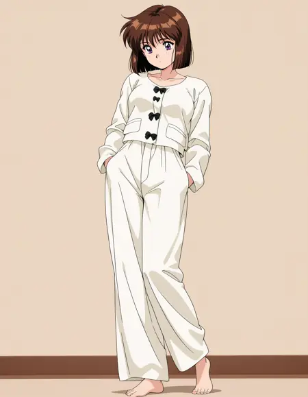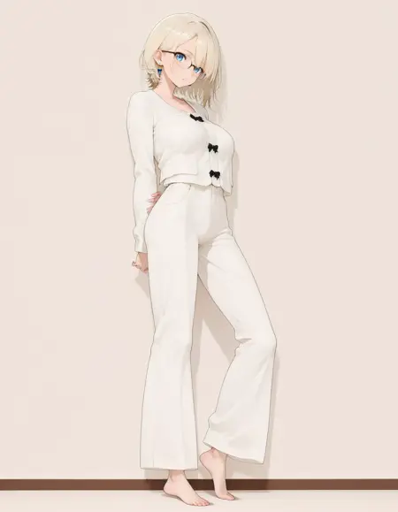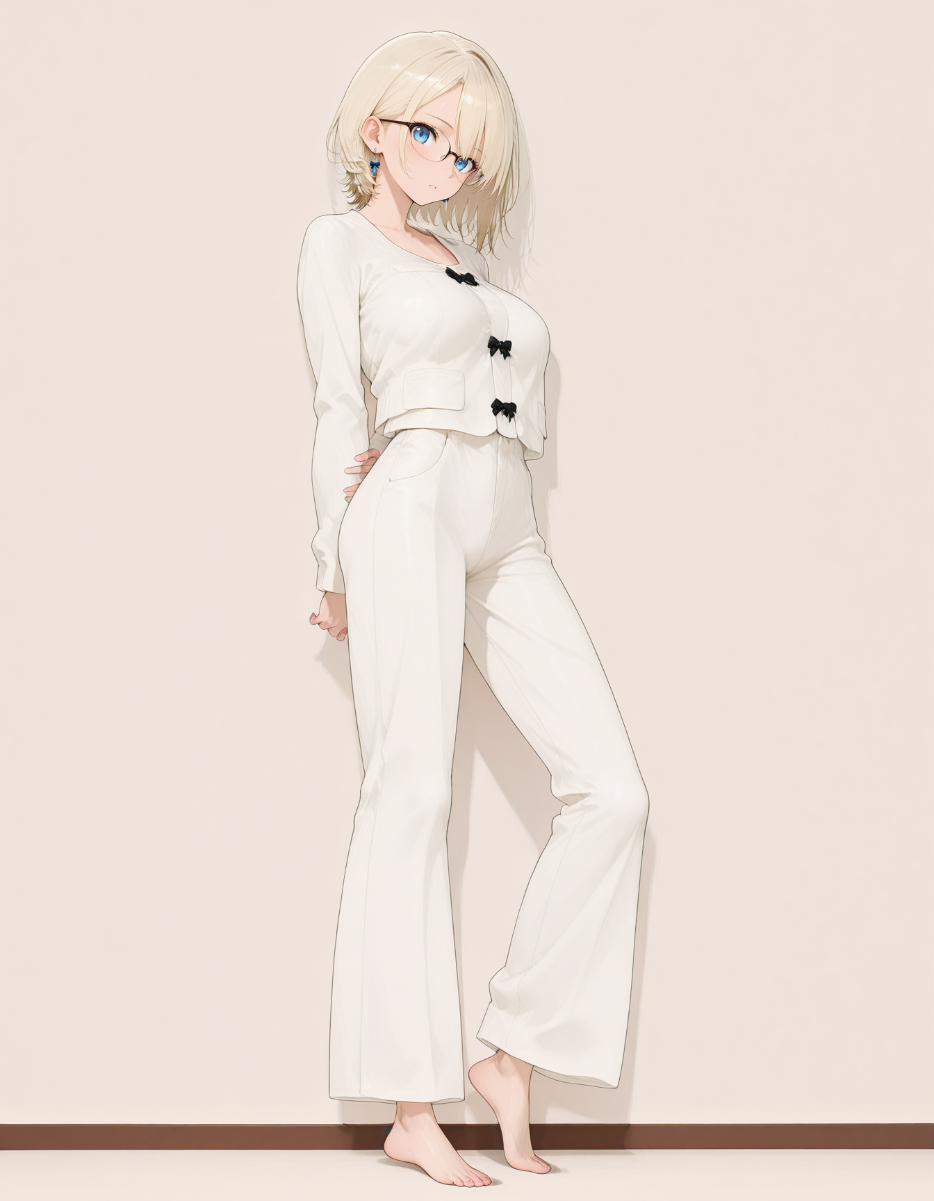 mai_white_jacket,black_bow,white_pants,baggy_pants,collarbone,barefoot