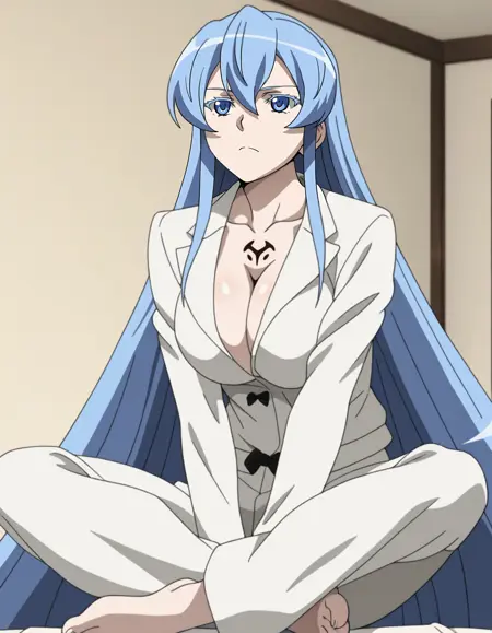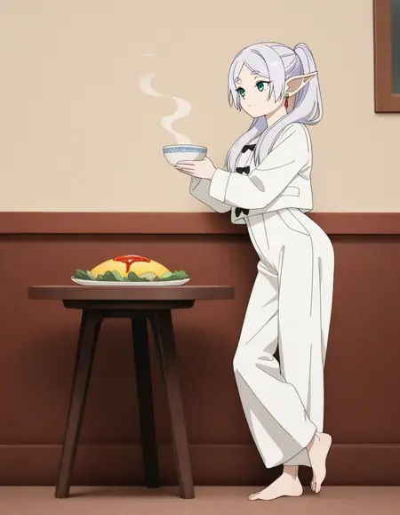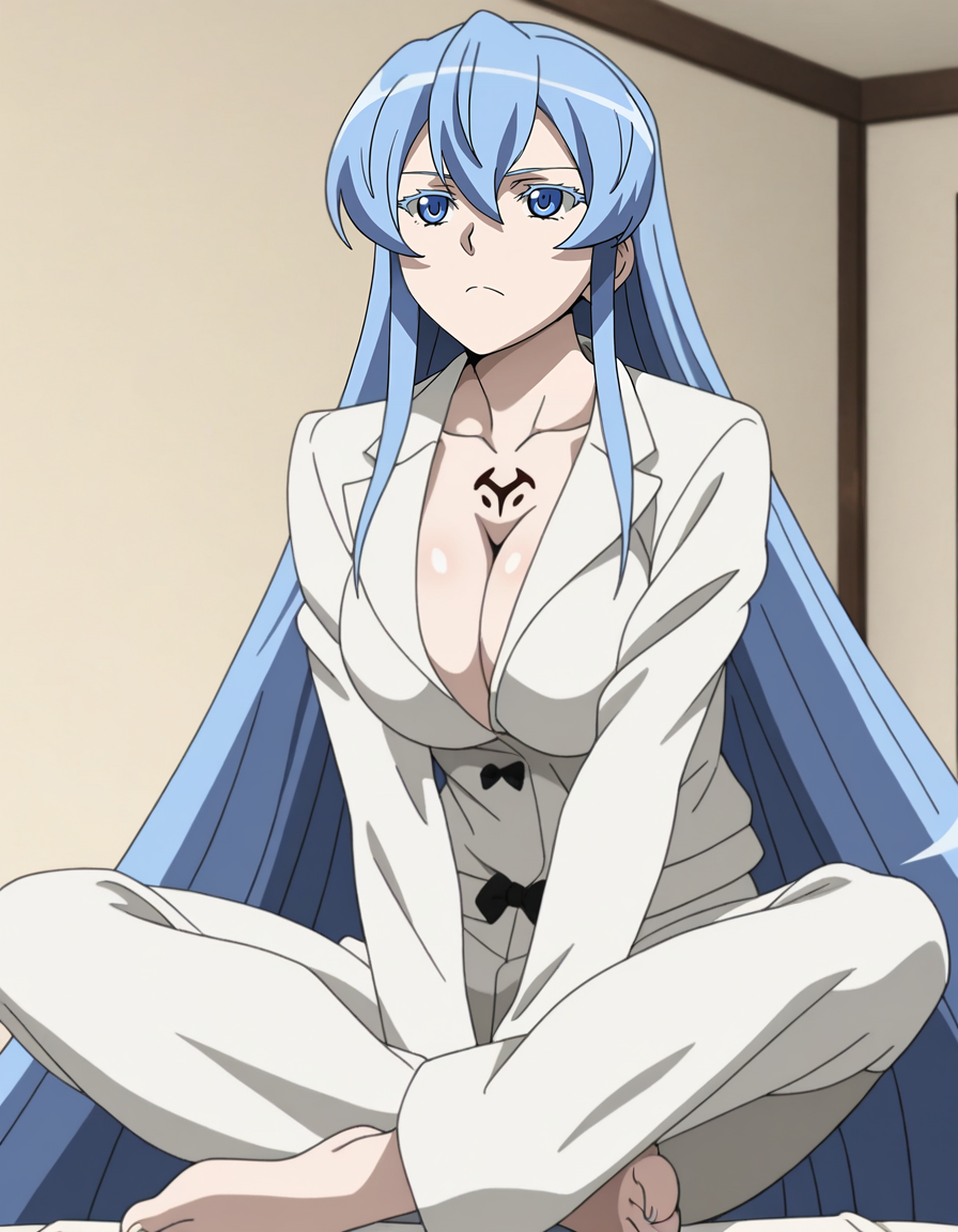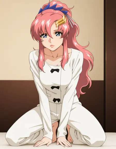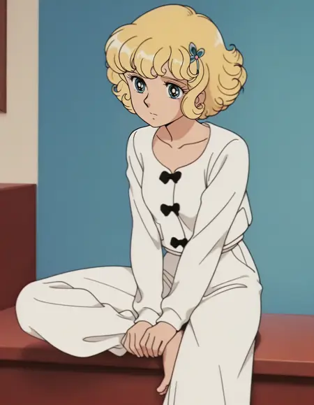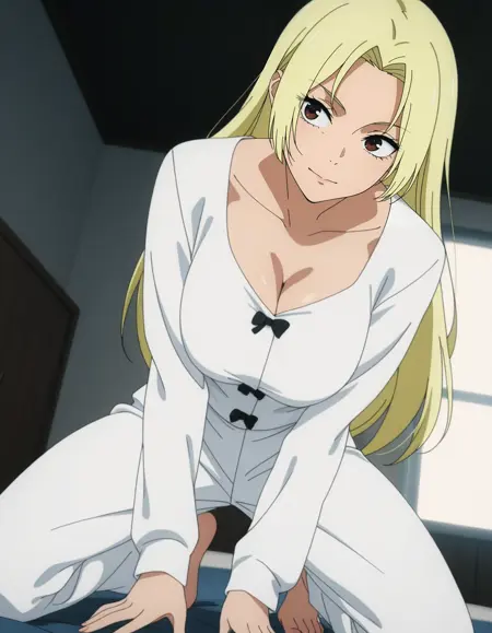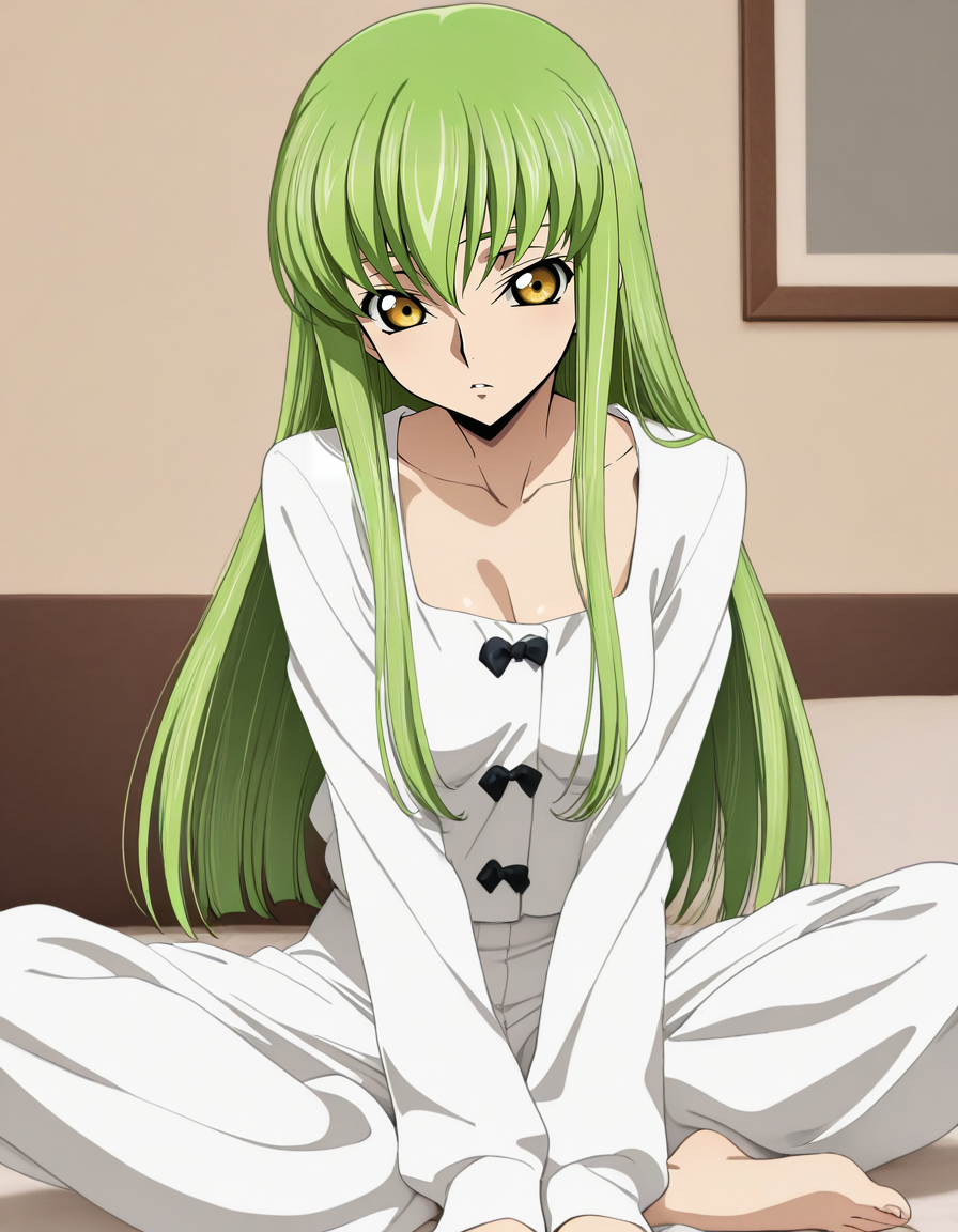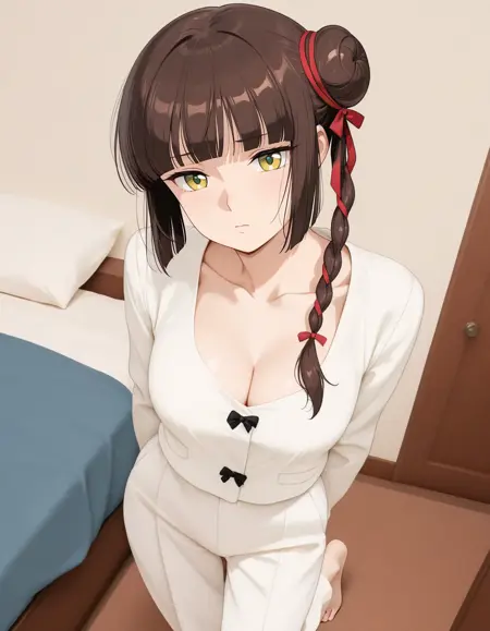 mai_white_jacket,black_bow,white_pants,baggy_pants,collarbone,barefoot