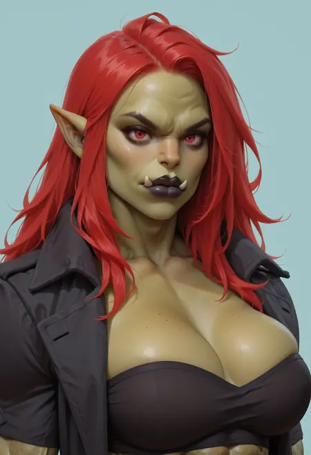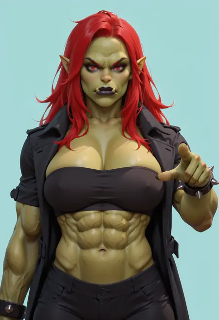 urzilf, 绿色皮肤, 彩色皮肤, 黑色嘴唇, 肌肉发达, 尖耳朵, 乳房, 红色眼睛, 红发, 外套, 裤子, 管状上衣, 带尖刺手镯, 靴子,