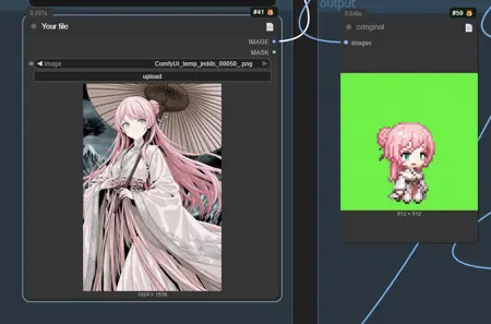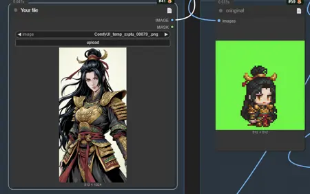 推荐提示词:将角色全身分割并转换为像素艺术风格的Q版精灵,简单绿色背景,Q版,A型姿势,双手下垂的简单站立姿势,面向右侧,大头小身,简约设计的游戏精灵