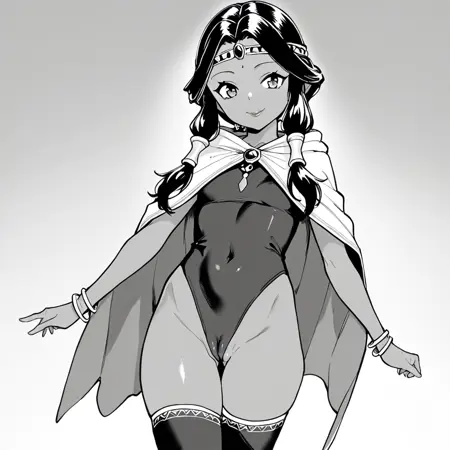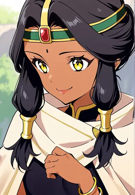 Character: black hair, dark skin, bracelet, dark-skinned female, two side locks, single hair bang, sidelocks, bindi, lips