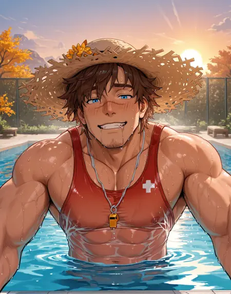 기본: 코 흉터, 파란 눈, 갈색 머리카락, wftaichi, 미소, 단발, 안면 털,