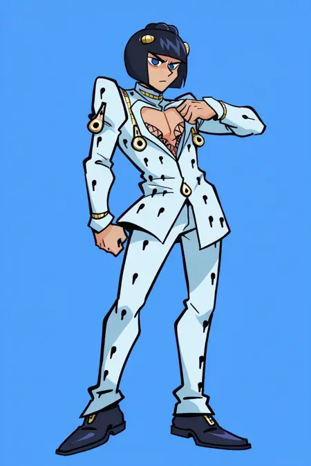BrunoBucciaratiFNF, 1boy, black hair, short hair, blunt bangs, blue eyes, white outfit, bruno bucciarati