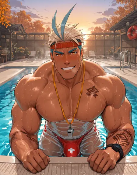 ベース: (青いアンテナ髪:1.2)、ブロンドの短い髪、ツートーンヘア、多色の髪、オレンジ色の目、肌の黒い男性、V字型の眉、ヘッドバンド、筋肉質な男性、裸足、腕輪タトゥー、筋肉質な男性