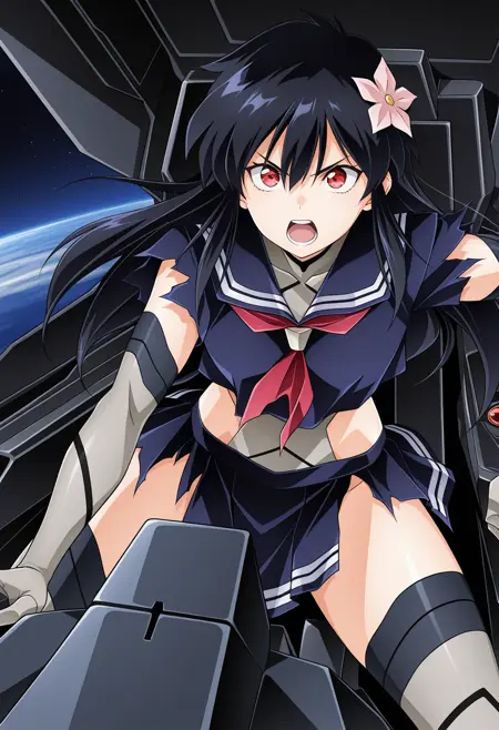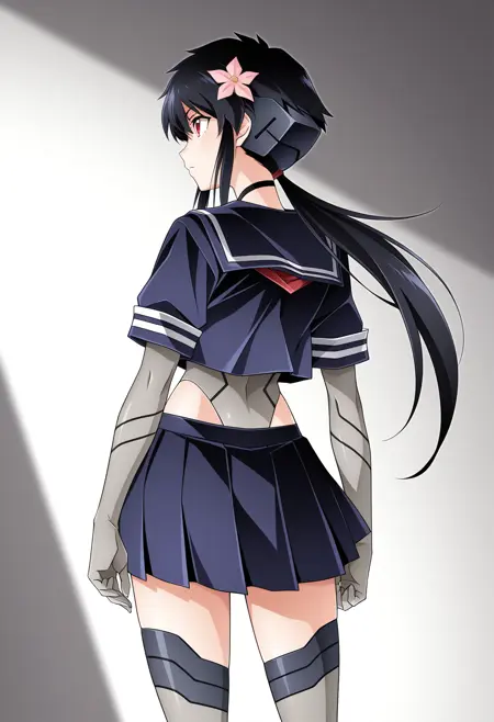 衣装: 髪飾り, 髪の花, セーラー服, プリーツスカート, 腹出し, 衣装の下のグレーのレオタード, (グレーのエルボーグローブ:1.1), グレーの手袋, グレーのハイソックス, アンクルブーツ,