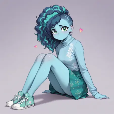 CLOTHES: light blue/lilac turtleneck with white inserts, loose, soft cut. She wears a green skirt with a floral pattern, namely pink hearts. Shoes - light green sneakers with light blue laces.