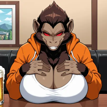 正面提示词:GreatAV,毛茸茸的男性,拟人化,猴子,猿类,灵长类,尖耳朵,红色眼白,无瞳孔,深棕色头发,深棕色毛发,猴子尾巴