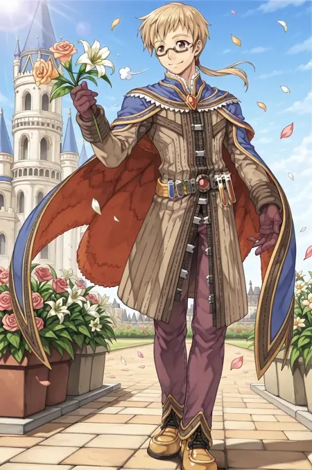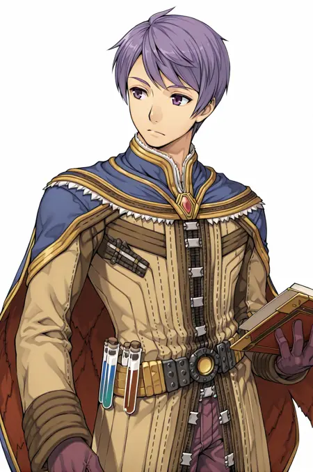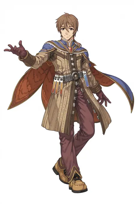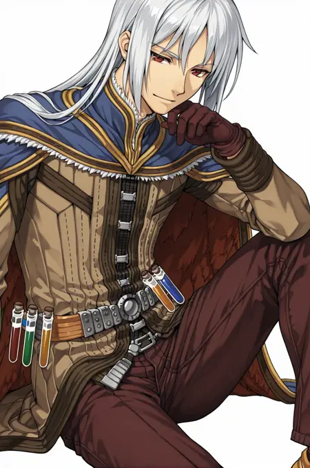 prompt: alchemyROMale, gloves, long sleeves, capelet, cape, belt, pants, jewelry, test tube, shoes,